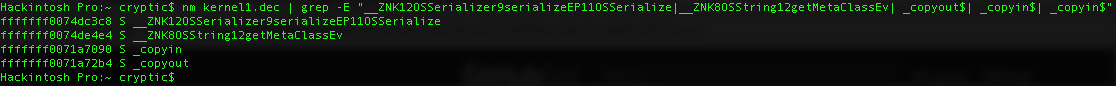 nm kernelcache.dec | grep -E "__ZNK12OSSerializer9serializeEP11OSSerialize|__ZNK8OSString12getMetaClassEv| _copyout$| _copyin$| _copyin$"This will get us