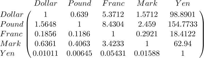 DELETE n, rConsider a spot market consisting of the following currencies and exchange rates: