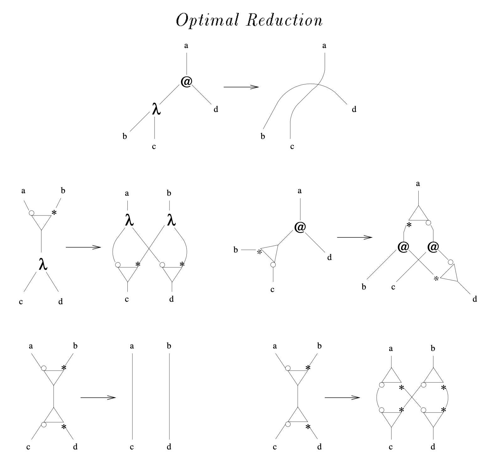 These simple graph-rewrite rules form the core algorithm to evaluate λ-terms! λ nodes represent lambdas, @ nodes represent applications, and the triangles represent cloning. As the "optimal" word implies, there is no way to reduce lambda terms faster than this approach, because it ensures no work is needlessly duplicated (which is the main issue with tree-based evaluators). In other words...