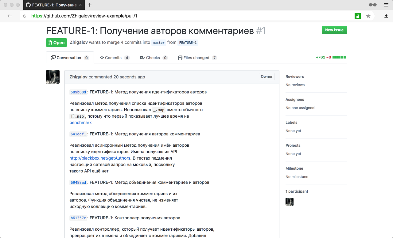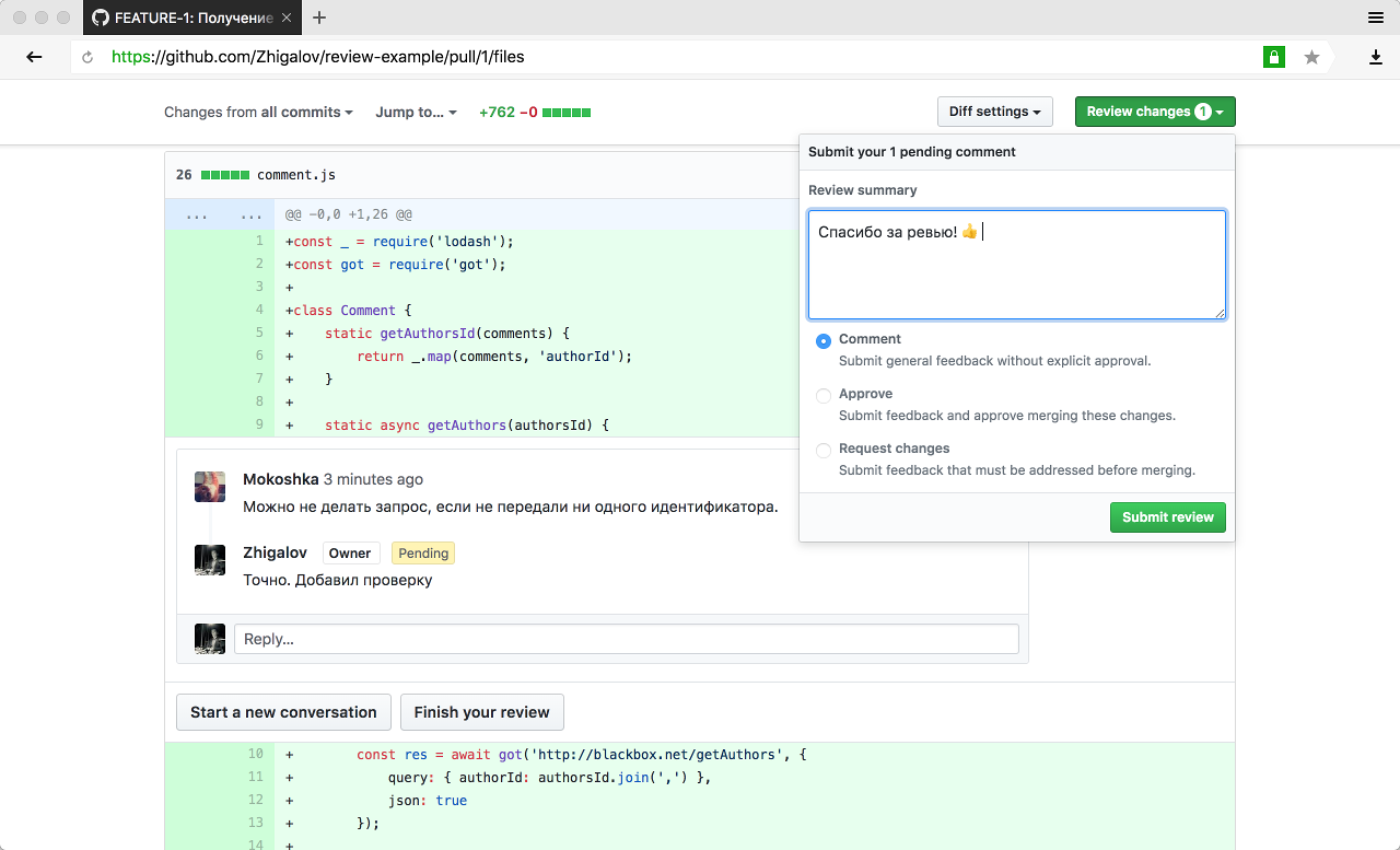 Вернёмся к пулреквесту, который я готовил в первой части статьи. Ревьювер написал комментарии. Наступает этап правок и обсуждений.