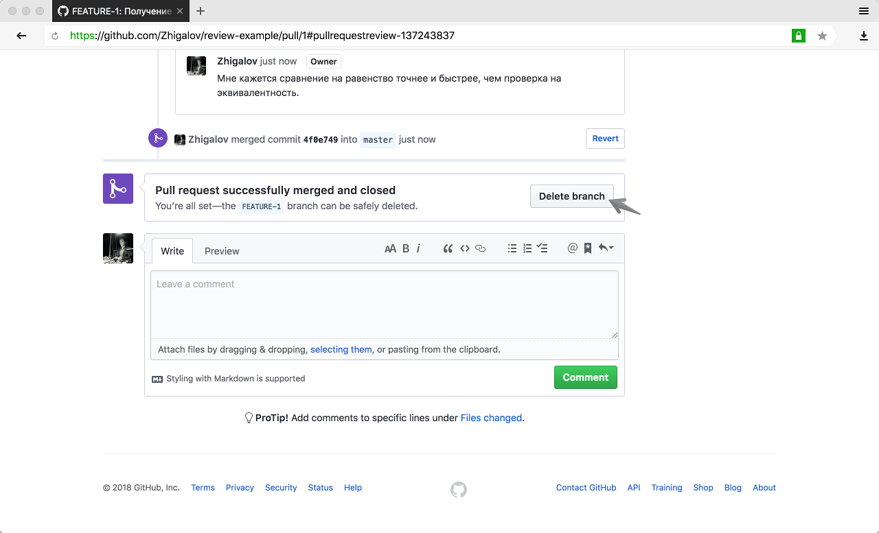 git branch -D FEATURE-1Спасибо Вадиму Макишвили за редактуру и полезные вопросы. Олегу Мохову за рекомендации, после которых я чуть больше чем полностью переписал статью. Тане Занаховой, за вычитку всех орфографических и пунктационных ошибок. Без вас ничего бы не получилось. Спасибо вам большое!