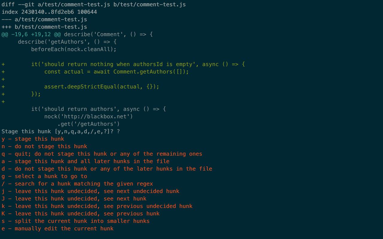 Нет проблем, если разные файлы попадают в разные коммиты. Чуть сложнее становится, когда один файл нужно разбить на несколько коммитов. Для этого подходит частичное добавление. Сделать это можно командой git add --patch test/comment-test.js