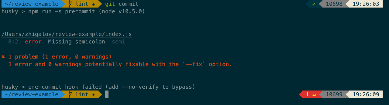 С моим любимым WebStorm этот линтер работает "из коробки". Я вижу и исправляю проблему сразу, как только написал код, а не оставляю эту работу на потом. Перед коммитом линтер запускается автоматически при помощи husky.