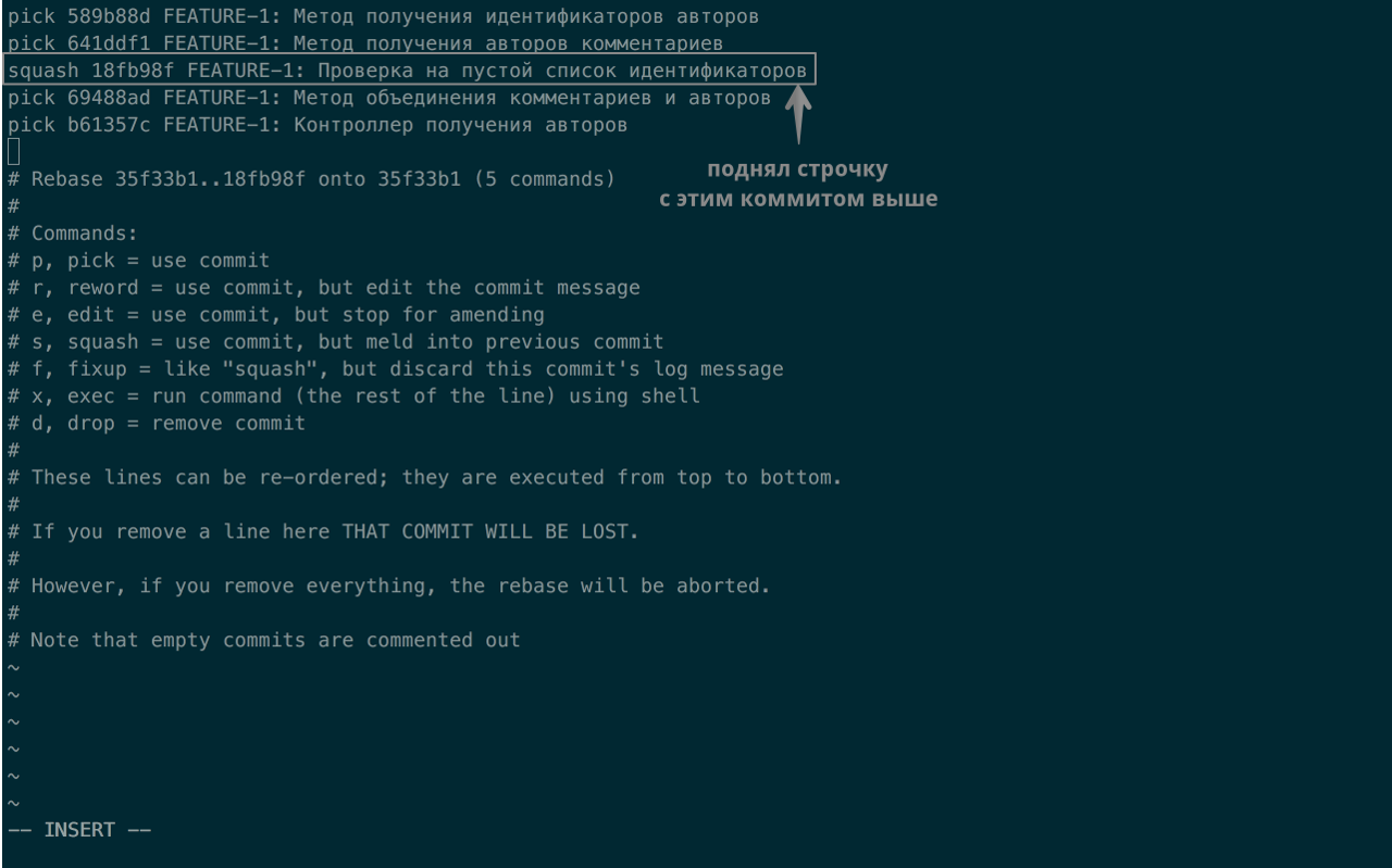При выполнении команды git rebase --interactive master первым делом нужно определить порядок коммитов. Выстраивайте строки с коммитами в нужном вам порядке. Строки с ненужными коммитами удаляем. Если нужно объединить несколько коммитов, то у первого оставляем отметку pick, остальным заменяем pick на squash.
