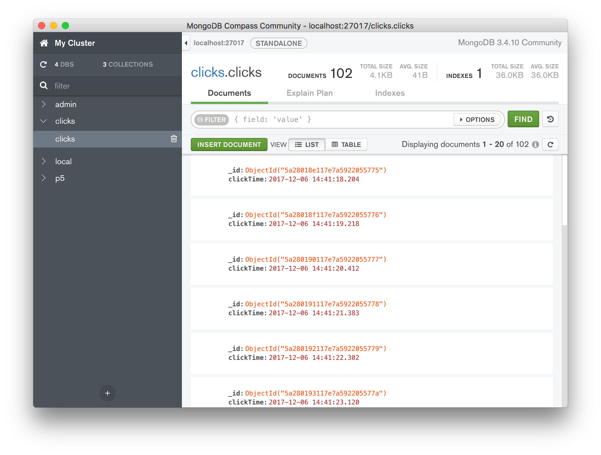 If you try this out and view the content of your database (via a tool like Compass) you will see these new documents appearing in your clicks