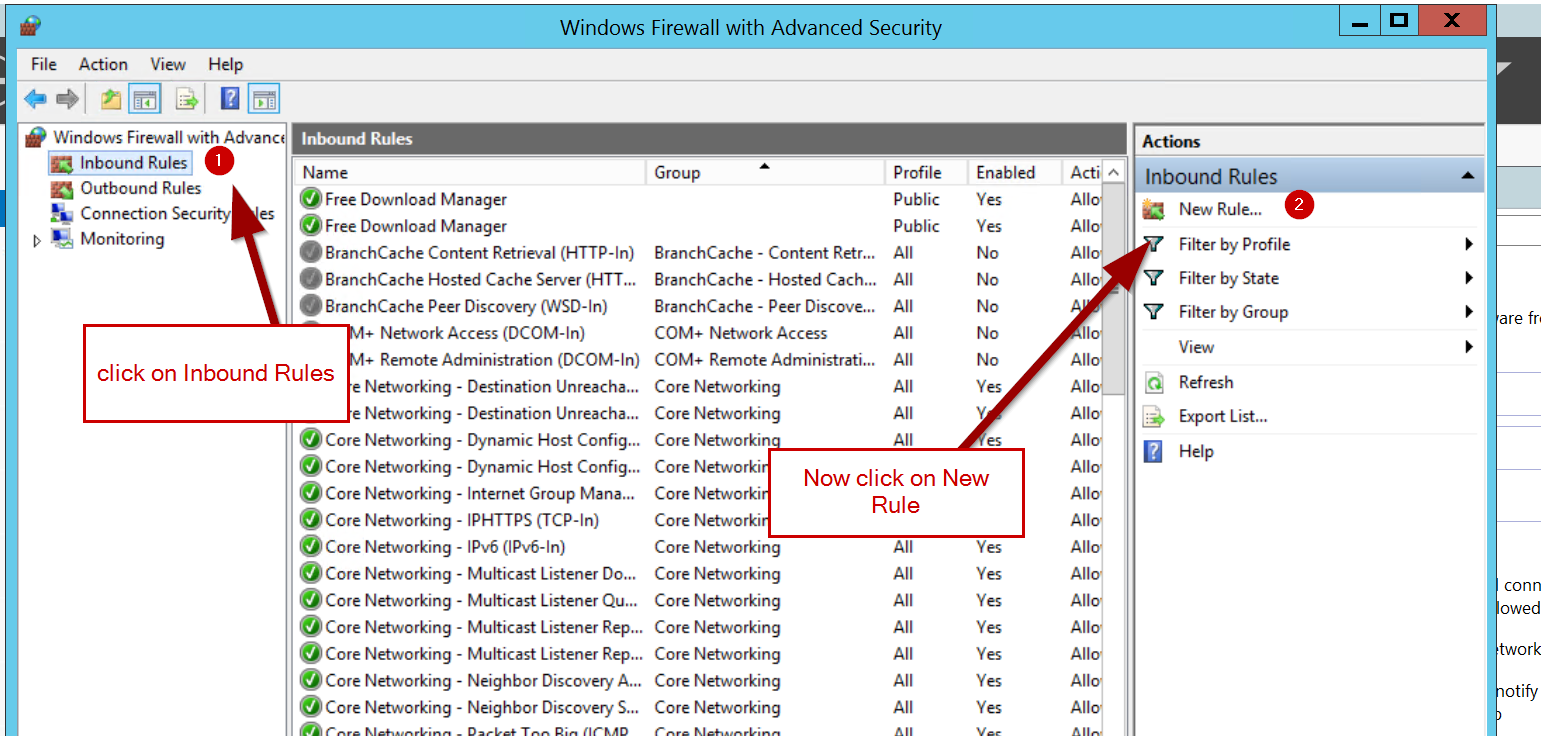 a.) Click On server manager b.) select "Local Server" c.) Click on "Windows Firewall: PUblic: On" (on public On) d.) Will be opened a new window where you can control windows firewall. (Control Panel\System and Security\Windows Firewall) e.) Inside this window click "Advanced Settings" at left sidebar f.) Will be opened Windows Firewall Window g.) Now click on "Inbound Rules" at left Sidebar, and then click on "New Rule" button at right sidebar.