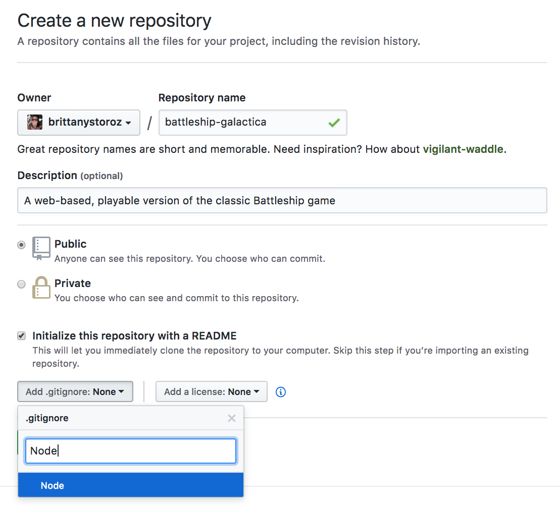 Use the GitHub UI to create a new repo, and make sure you initialize it with a README and a .gitignore file. You can select a preset .gitignore file from the dropdown menu. Node is usually a good one to choose. (Feel free to read more about gitignore files here). You can disregard the 'Add license' option.