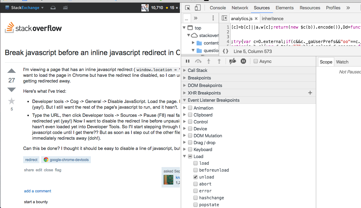 window.addEventListener("beforeunload", function() { debugger; }, false)