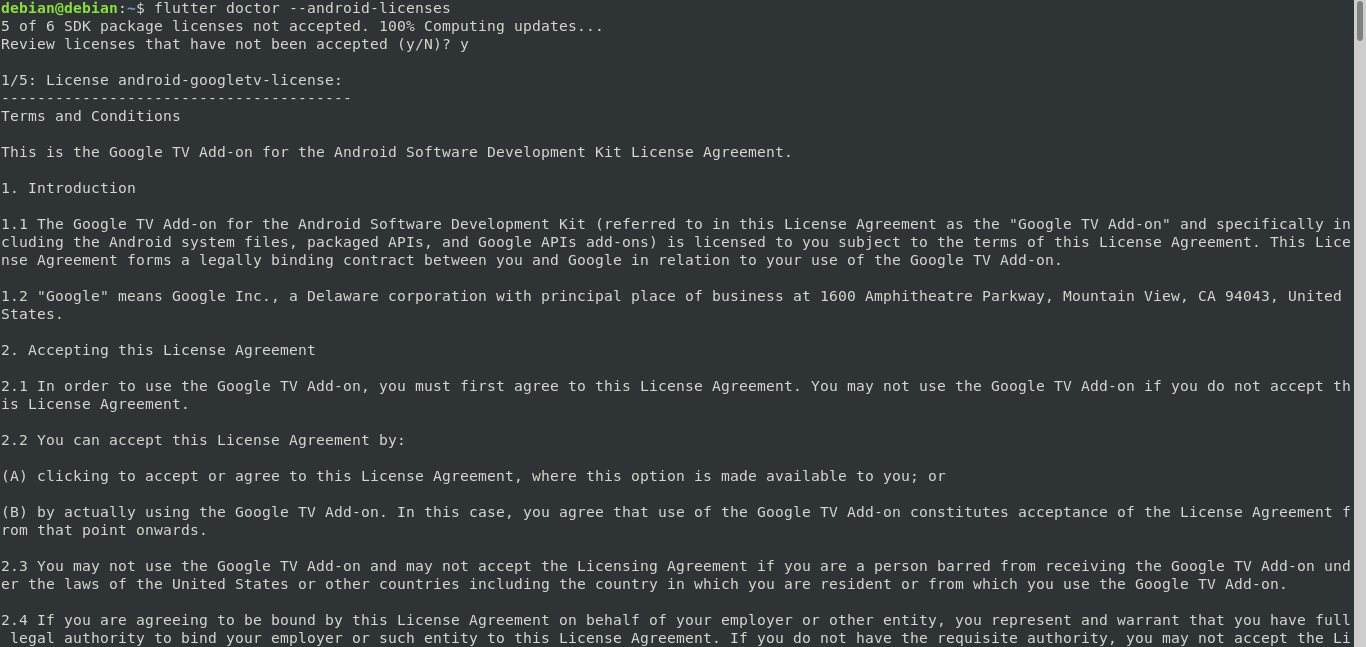To use Flutter, the user must agree to the licenses of the Android SDK platform. Here is the command for the same: