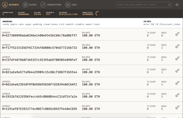 $ npm install -g truffleAnd now, for running a local blockchain for our development environment, there are several ways of doing it, but the easiest is to download Ganache, once you download it and execute it, you'll have a fully functional blockchain ethereum network for you to deploy and test your contracts.
