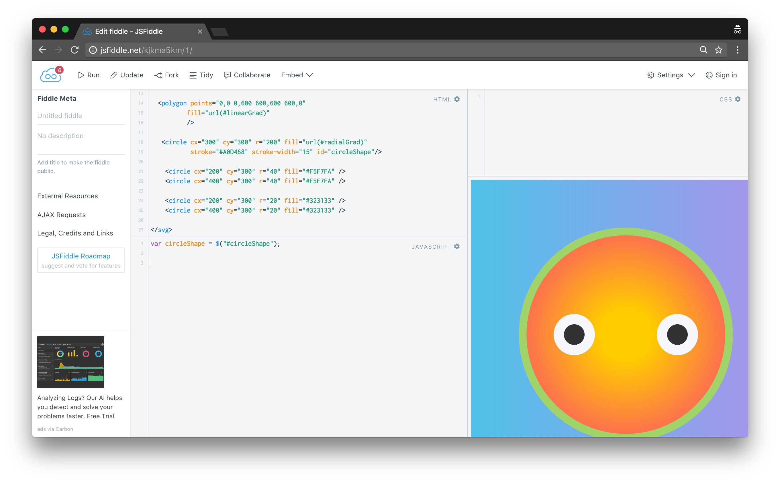 We're going to be using a website called JSFiddle to create our own emojis. First we need to open JSFiddle in a new tab (right click and open in new tab) http://jsfiddle.net/