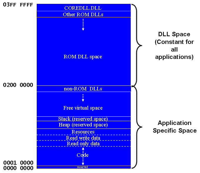 At address 0xC000 0000 there is a 128-MB region where the ROM-based DLLs loaded by the kernel are mapped. The 128-MB region just above this at 0xC800 0000 is used by the file system to map the RAM-based object store.