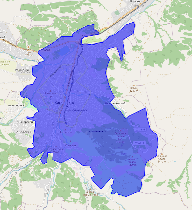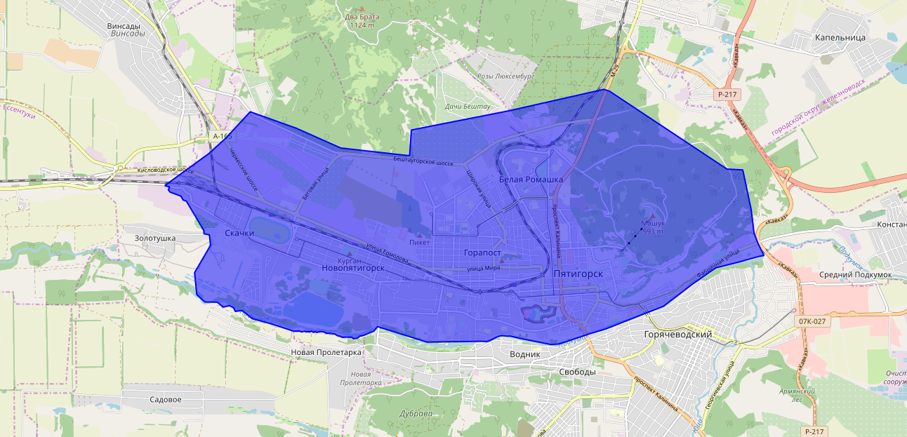 Границы городов в OSM обычно обозначаются мультиполигонами. Откроем на карте требуемую область и составим следующий запрос для города. В данном примере это будет Пятигорск: