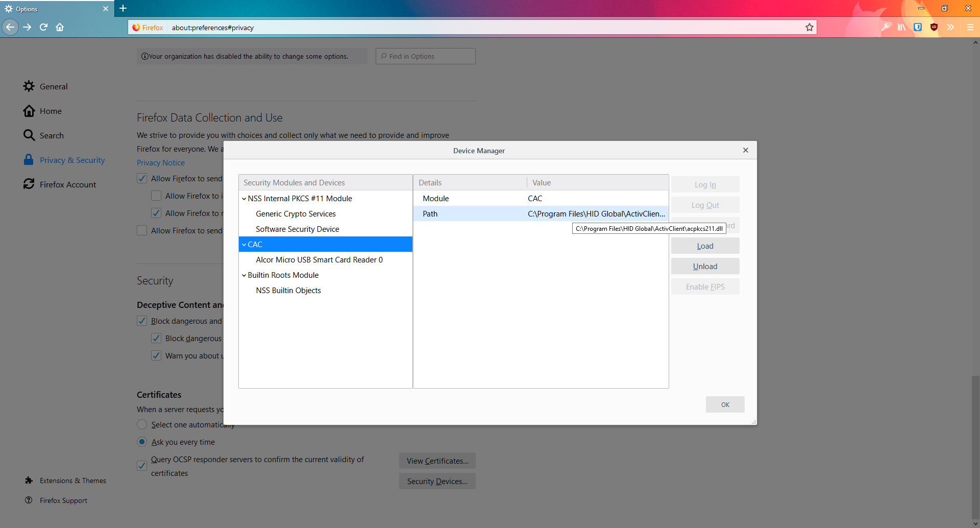 Okand restart Firefox. - Test a CAC site.