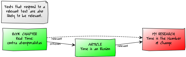 An item can also be relevant on account of another, as a function of its order to other parts of the scientific conversation. If article A is relevant in itself, for it’s central exposition of some thesis in my field, and book B presents poignant objections to the arguments of A, then I cannot rely on or object to A without taking B also into account. As each part of the conversation is ordered to other parts as dependent, developing, responding, contradicting &c, I must trace this order to find which individual items are relevant for my research, or my contribution is wont to be redundant either because it merely repeats what has already been said or because my arguments have already been defeated in some text that I didn’t bother to read.