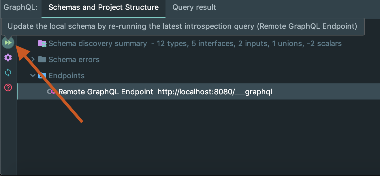 - To update the local schema file that PhpStorm is reading from (for example if you add a field to your API or whatever) then you can use the Update button in the GraphQL tab: