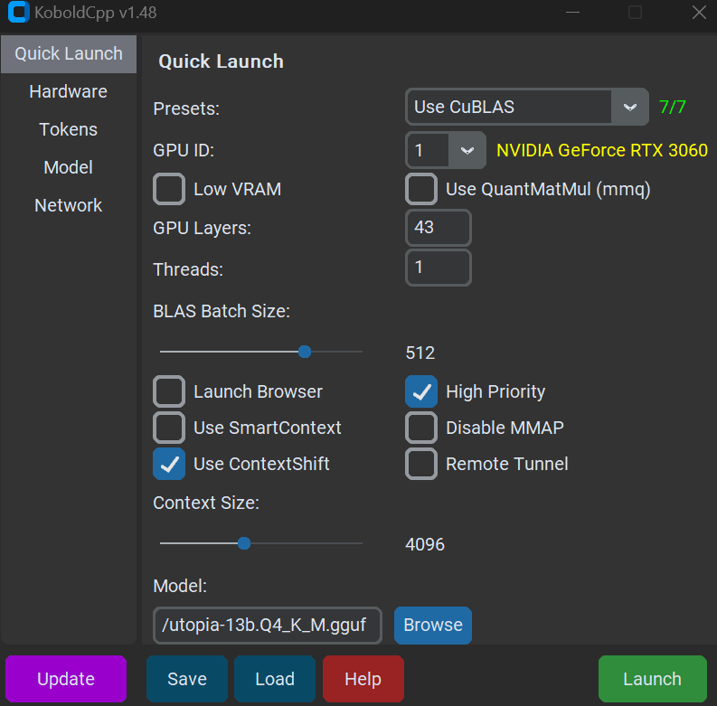 Select your model and with CuBLAS enabled if you’re a NVIDIA user. Then hit ‘Launch’.