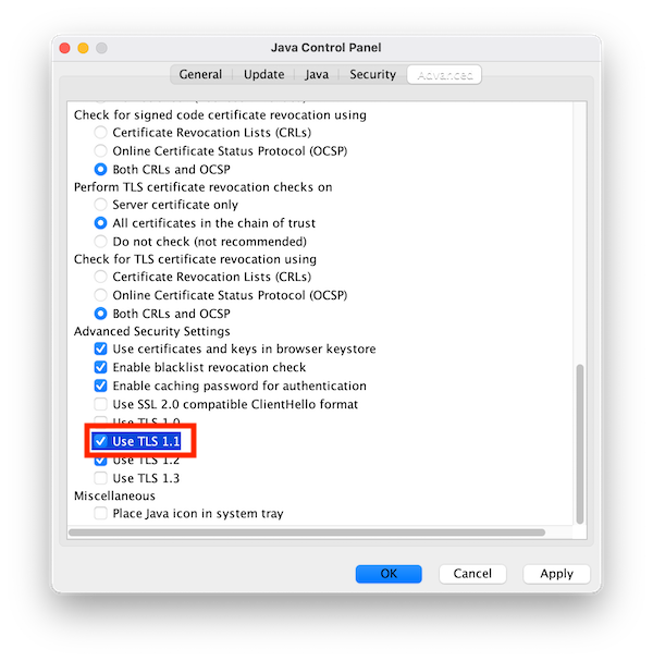 To re-enable TLSv1.1 support open Java Control Panel (e.g. on macOS it's under -> System Preferences -> Java). Navigate to the "Advanced" tab and check "Use TLS 1.1".