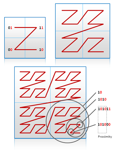 伝統的な地形情報システムはインデックスにいくつかのQuadtreeかR-Treeのバリエーションを利用している。これらのデータ構造はin-placeに更新される必要があり、データボリュームが巨大なときには操作が高くつく。代わりのアプローチは、2D構造をトラバースしてエントリーのプレーンなリストに引き延ばすものだ。このテクニックの良く知られた例はGeohashである。GeohashはZ-likeスキャンで2D空間を満たし、それぞれのムーブは方向によって0か1にエンコードされる。軽度と緯度のビットは移動するたびに交互に移動する。このエンコーディングプロセスは以下の図のように表され、黒と赤のビットはそれぞれ軽度と緯度を表す。