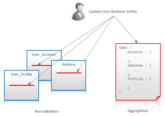 パワフルなトランザクション機構がリレーショナルデータベースの不可欠な部分である理由の一つは、正規化されたデータは典型的には複数箇所の更新が必要とされるからである。一方、集計(Aggregate)では単一のビジネスエンティティを単一のドキュメント、行、またはkey-valueペアとしてストアし、自動的に更新することが可能である。