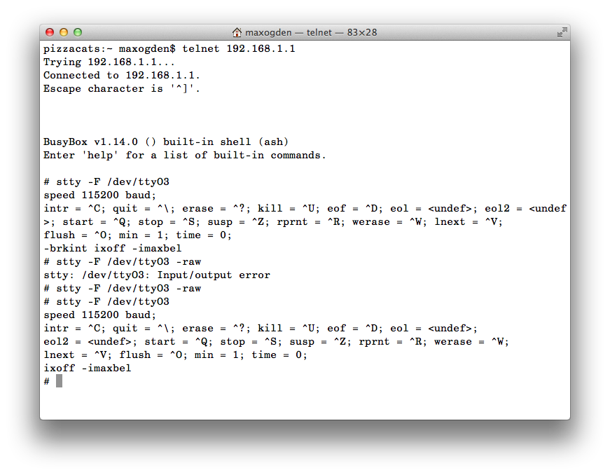 cat /proc/cmdlineand find out whichttydevice the 'console' is set to. on my drone it wasttyO3 - set the tty socket to raw mode: