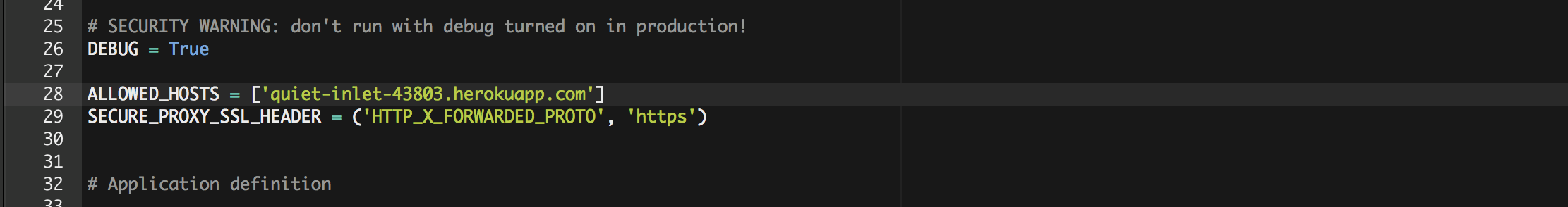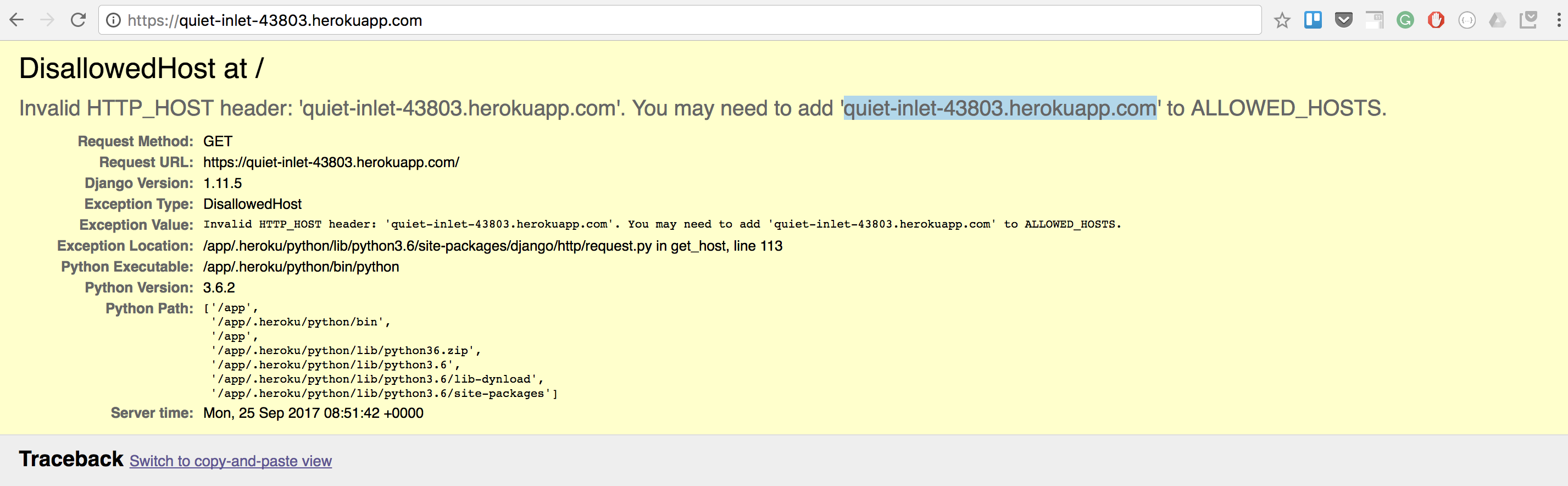 We can correct for the error now that we know the domain by adding the domain to the settings.py file. Note the domain to put is the one generated by your application.