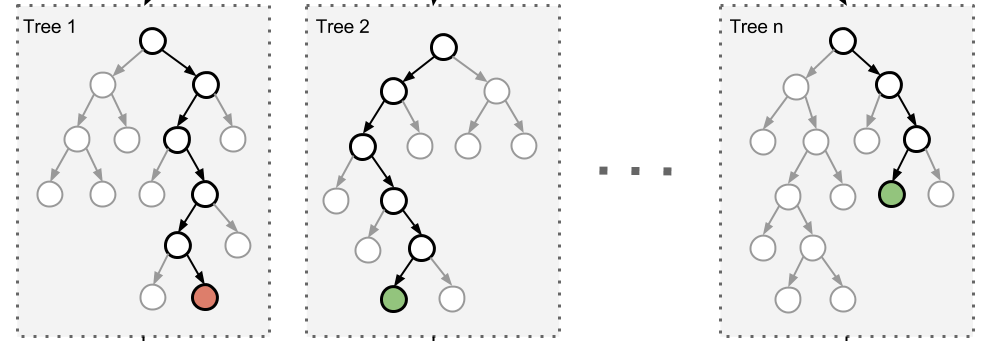 在极限随机树(extremely randomized tree)算法中,随机性更近了一步:分裂阈值是随机选取的。与寻找最具有判别性的阈值不同,极限随机树为每个候选特征选取一个阈值,并将这些阈值的最佳值作为最终的分割阈值。这通常会降低方差,偏差会稍微增大。