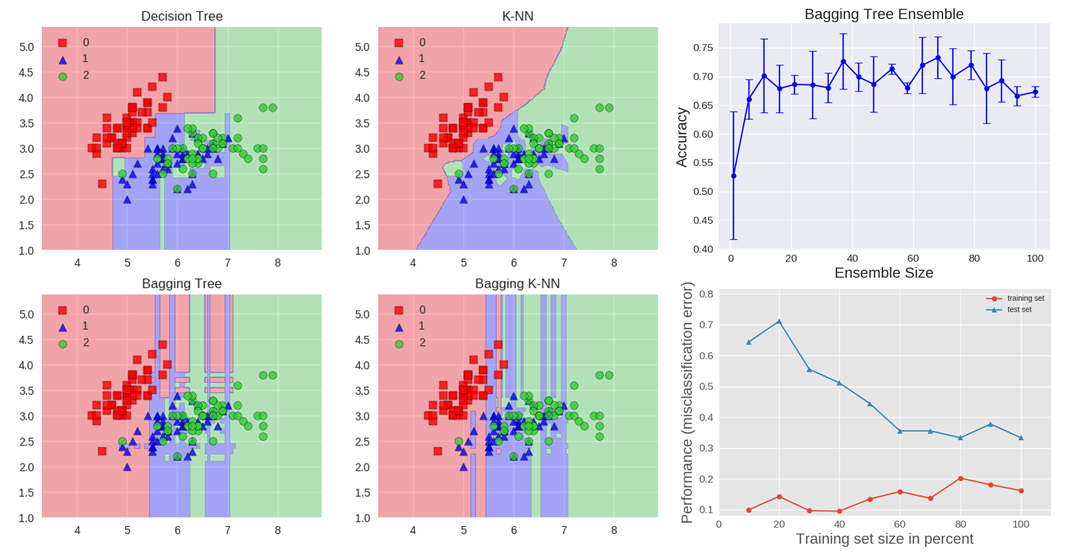 我们可以通过在 Iris 数据集上执行分类任务来学习 bagging。我们选择两种基学习器:决策树(decision tree)和 kNN 分类器。下图显示了基学习器在 Iris 上学习到的决策边界和他们 bagging 集成之后学习到的决策边界。