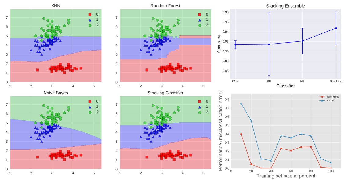 如上图所示,该 stacking 集成由 KNN、随机森林和朴素贝叶斯这几个基分类器构成,其预测输出再由逻辑斯底回归综合构成一个元分类器。我们可以看到 stacking 实现了决策边界的混合。上图还显示了 stacking 的准确率要高于单独的分类器,且基于学习曲线,模型没有过拟合的迹象。