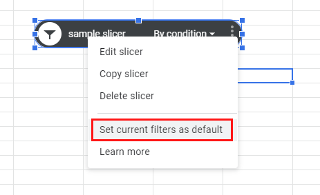 When Set current filters as default is selected (clicked), the setting of Slicer is saved. Please save the setting of current Slicer by selecting Set current filters as default. You can see Set current filters as default at the following figure.
