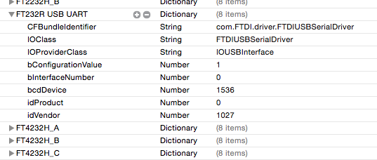 - Open the /System/Library/Extensions/FTDIUSBSerialDriver.kext/Contents/Info.plist and add new or change existing key/dictionary under IOKitPersonalities and make sure above 3 values(idVendor, idProduct, bcdDevice) are there and correct. All values must be decimals.