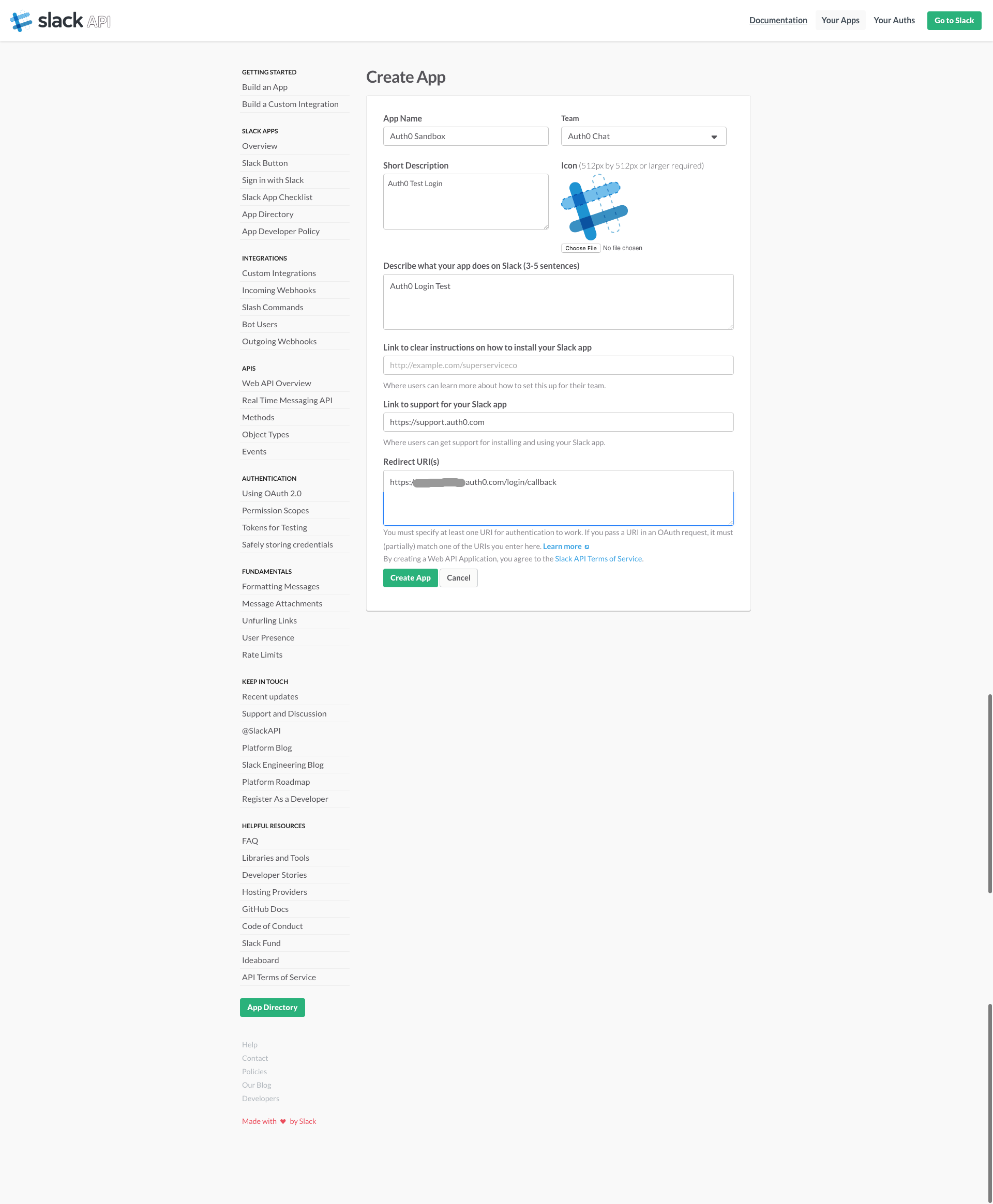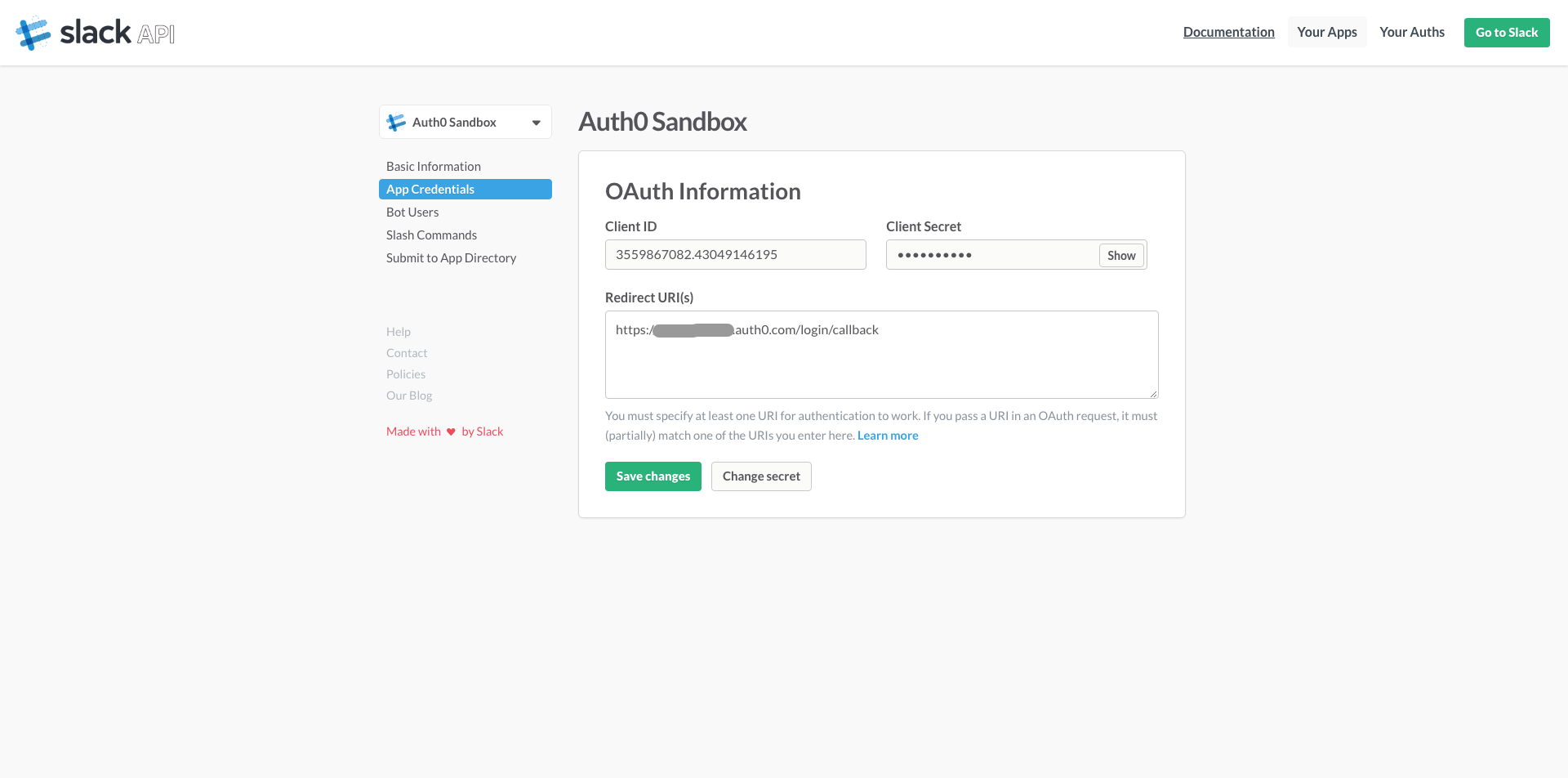 - Enter a Slack Client ID and Secret. To get those go to: https://api.slack.com/apps/new. Fill the fields and pay special attention to the Redirect URI. Enter: https://YOURS.auth0.com/login/callback. See screenshots below.